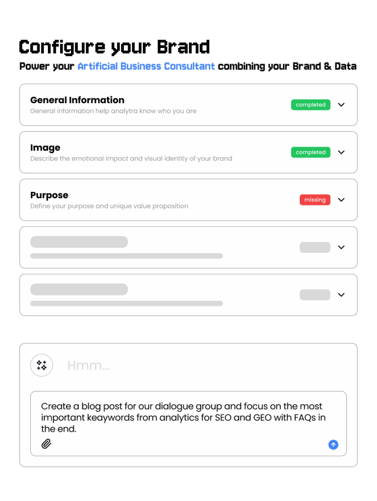 Dein einzigartiger artificial business consult steht nun bereit. analytra kennt deine Daten und deine Marke und beschützt beides mit eigenen Servern in Deutschland. Muss ja nicht jeder alles wissen.
