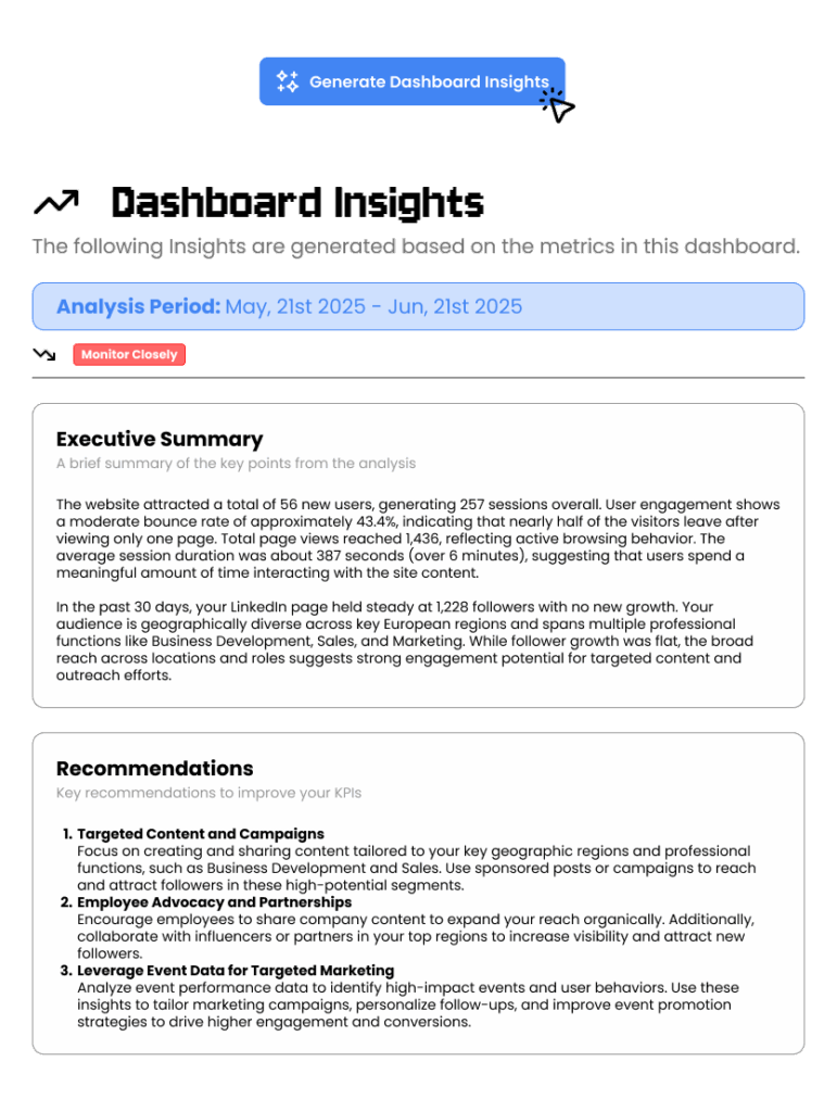 Unsere Dashboard Insights machen aus deinen Daten echte Aha-Momente. Sie zeigen dir, was wirklich zählt. Automatisierte smarte Tipps mit einem Klick – verständlich für alle. Damit du schnell verstehst, wie deine Kommunikation läuft. Und genau weißt, was als Nächstes zu tun ist.
