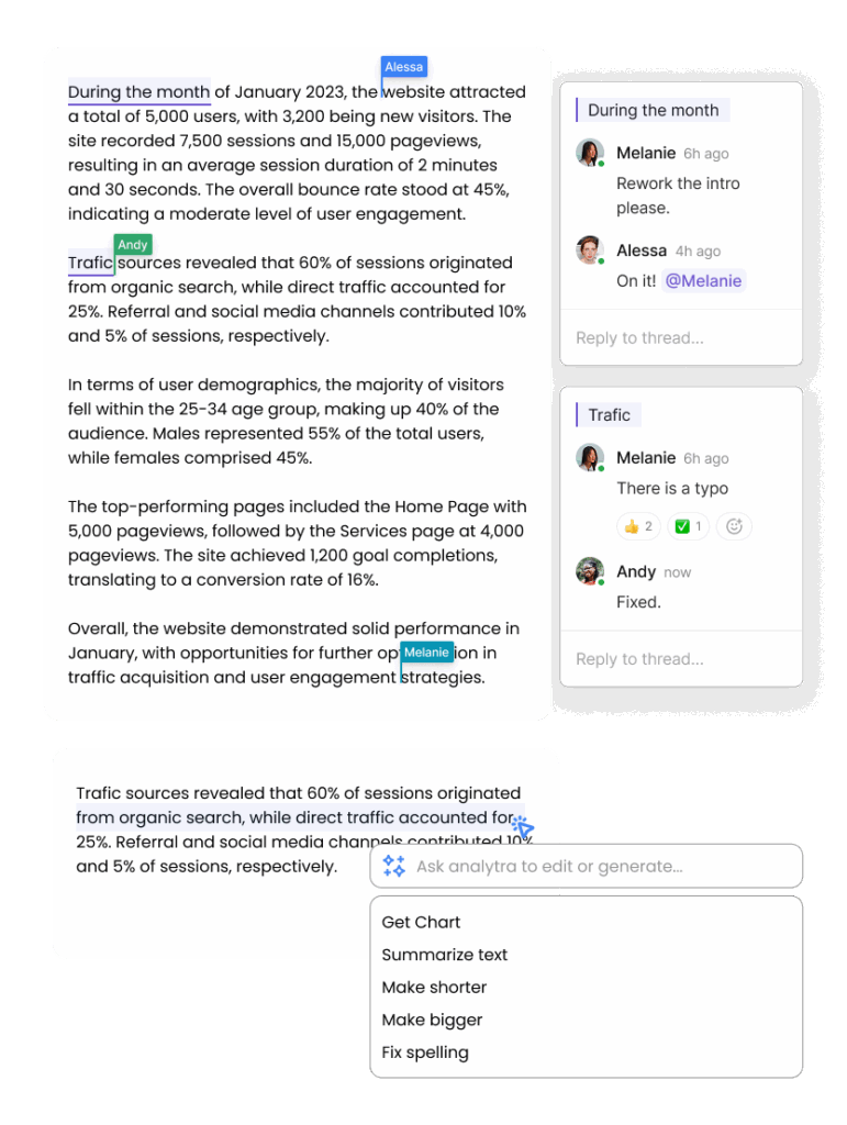 analytra wertet deine Daten automatisch aus und liefert dir klare Erkenntnisse sowie praktische Empfehlungen. Das Besondere: Du und dein Team arbeitet in Echtzeit gemeinsam an den Reports. Ihr passt Ergebnisse an und gestaltet Berichte, die genau erzählen, was eure Daten wirklich sagen. So trefft ihr zusammen schnellere und bessere Entscheidungen – ohne endlose Abstimmungsrunden.