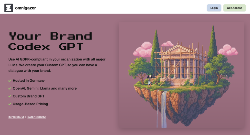 Hosted in Deutschland, kompatibel mit OpenAI, Gemini, Llama und Co., als Usage‑Based‑Pricing‑Angebot — also Custom Brand GPT für echtes Arbeiten mit Marke und Person.